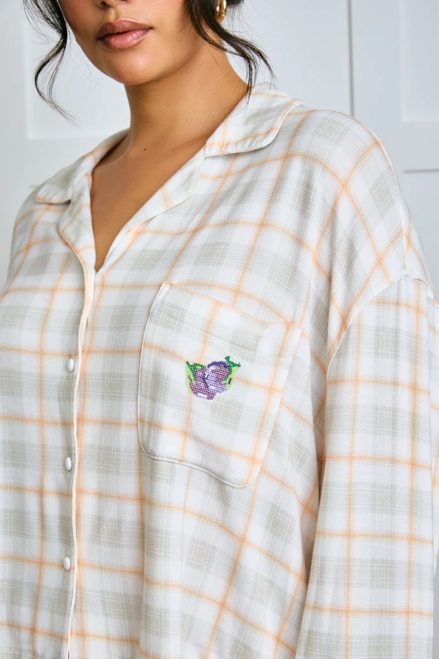 Made for slow summer mornings in the garden. This set is crafted in our classic butter fabric you know and love. Featuring cross stitch embroidered vegetables & fruits on the chest pocket, it’s a sweet nod to homegrown charm. Finished with candy dot buttons, it’s as playful as it is soft—designed to bring joy to your everyday routine.